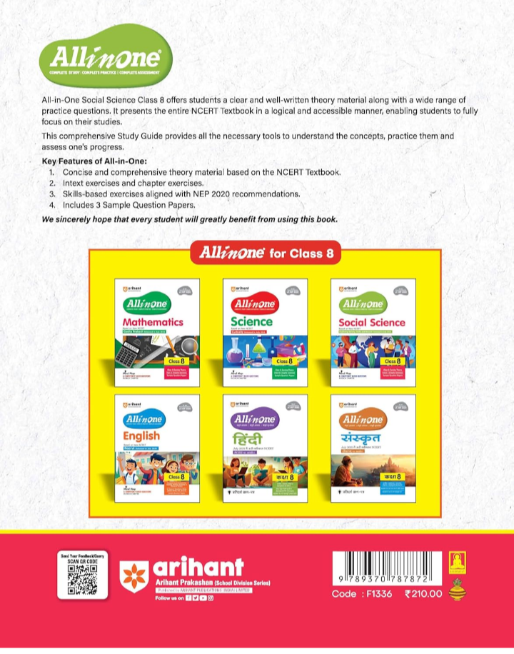 The Arihant All In One – Social Science for Class 8 is a complete guide designed to help students understand, practice, and assess concepts effectively. Based on the latest NCERT textbook “Exploring Society: India and Beyond” (Released July 2025) and aligned with NEP 2020 recommendations, it combines clear theory with ample practice.