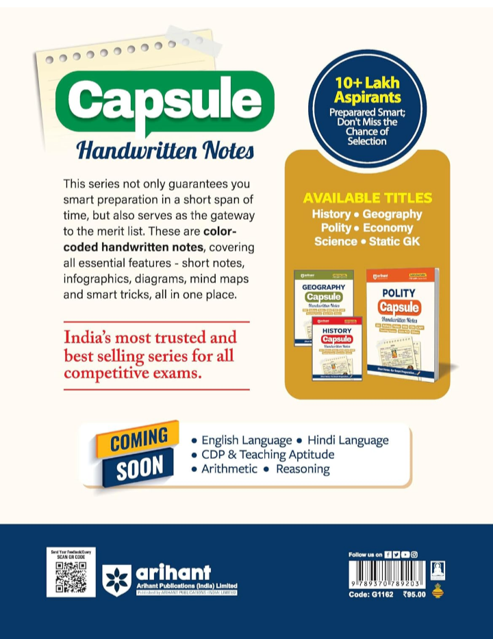 Enhance your preparation for competitive exams with Economy Capsule Handwritten Notes, a complete guide designed to simplify economic concepts and make them easy to understand and memorize. This book is ideal for SSC, Railway, Police, CDS, CAPF, and other competitive exams, offering concise, visually engaging, and exam-focused content.