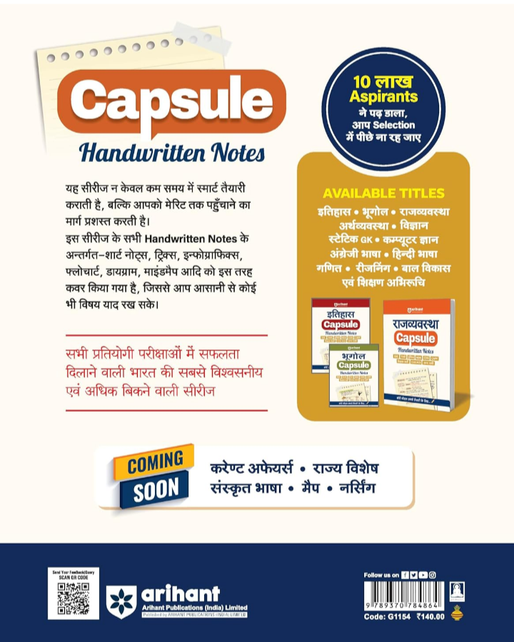 The Arihant हिन्दी भाषा Capsule – Handwritten Notes is a bestselling quick-reference guide crafted for aspirants of various competitive exams like SSC, Police, DSSSB, State PCS, AE/RO, IBPS RRB, CTET/TETs, B.Ed, TGT/PGT, and other state-level tests. With its concise handwritten-style notes, this capsule offers a smart and effective way to revise the entire Hindi Language syllabus. It simplifies complex topics, provides exam-relevant content, and enables aspirants to prepare quickly and efficiently within a limited time.