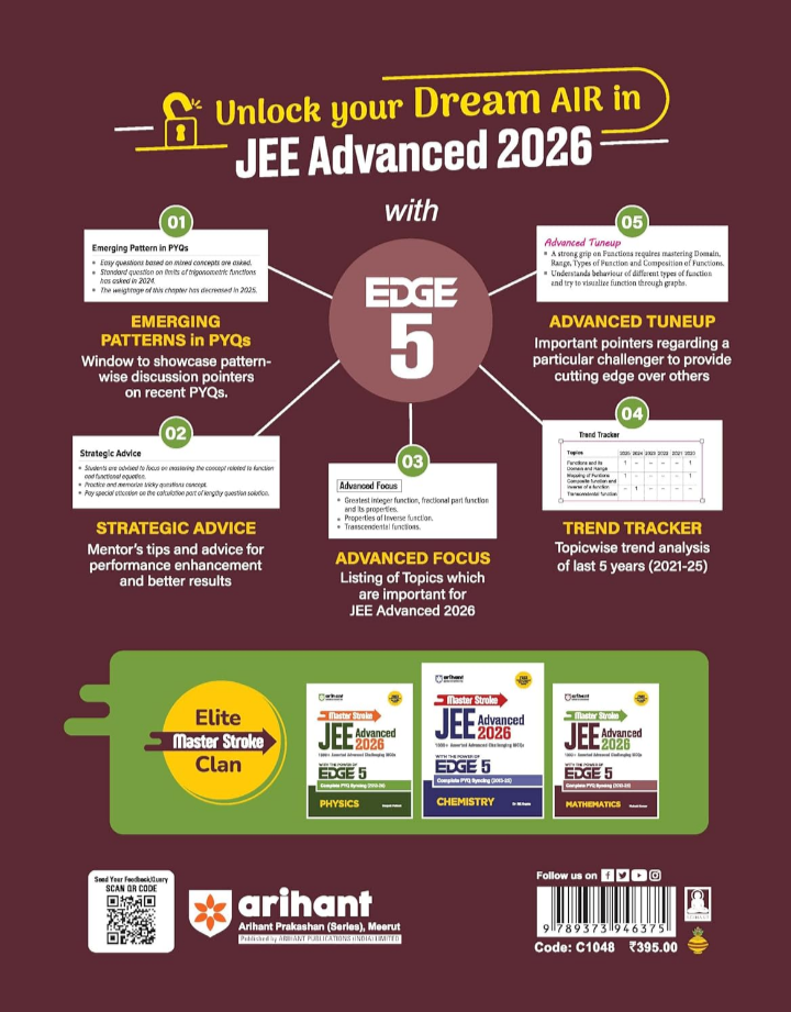 The Master Stroke JEE Advanced 2026 – Mathematics with EDGE 5 is a dedicated practice and strategy book designed to help aspirants crack JEE Advanced with confidence. It offers 1000+ advanced MCQs, synced with 13 years of JEE Advanced PYQs (2013–2025), supported by detailed solutions.